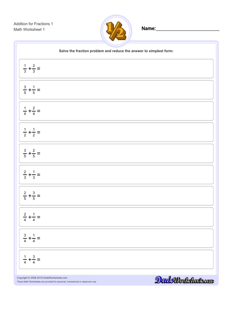 Addition Worksheets - Math Dad Addition worksheets based on addition facts, one digit and two-digit addition is printable. Toggle navigation Math Dad. Grade 1; Grade 2; Grade 3; Math Worksheet; ... Math Game to practice addition, subtraction, multiplication or division. Download it today at: Play online games: Addition Worksheets - Math Worksheets 4 Kids The addition and subtraction fact family worksheets feature adequate exercises like sorting the set of numbers, finding the missing members, writing the four facts using houses, dominoes, pictures, number bonds, bar models and more. Utilize the template to create your own fact families. Math Worksheets Thousands of printable math worksheets for all grade levels, ... and math worksheets with mixed addition and subtraction problems. Subtraction Worksheets. Multiplication Worksheets. This is the main page for the multiplication worksheets. ... You'll find multiplication worksheets for Dad's Eight Simple Rules for Mastering the Times Table, ...